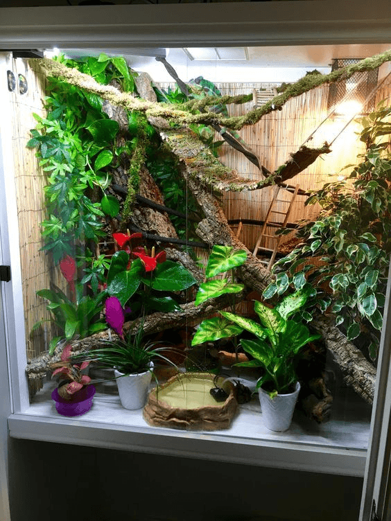 A tall, mesh enclosure with a UVB light, basking lamp, live plants, a misting or drip system, and proper temperature and humidity control.